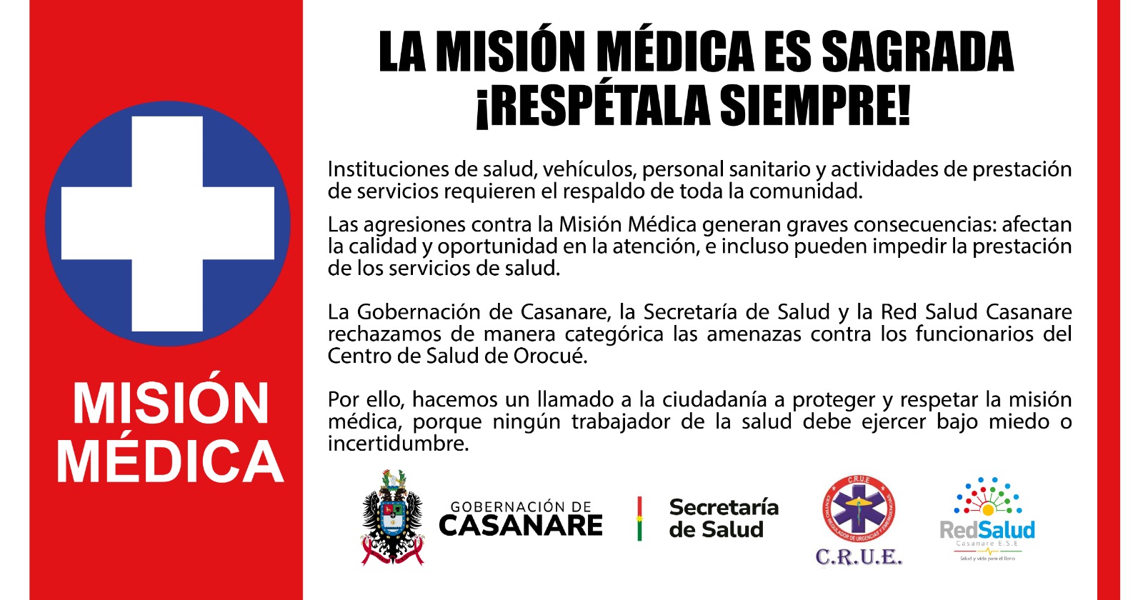 El comunicado recuerda que la Misión Médica —que incluye instituciones, vehículos, personal sanitario y la atención misma— es intocable y debe ser respetada. “Atentar contra ella no solo vulnera a los trabajadores de la salud, también pone en riesgo la vida de toda la comunidad al afectar la calidad y continuidad de los servicios”, enfatizó el gobierno departamental.