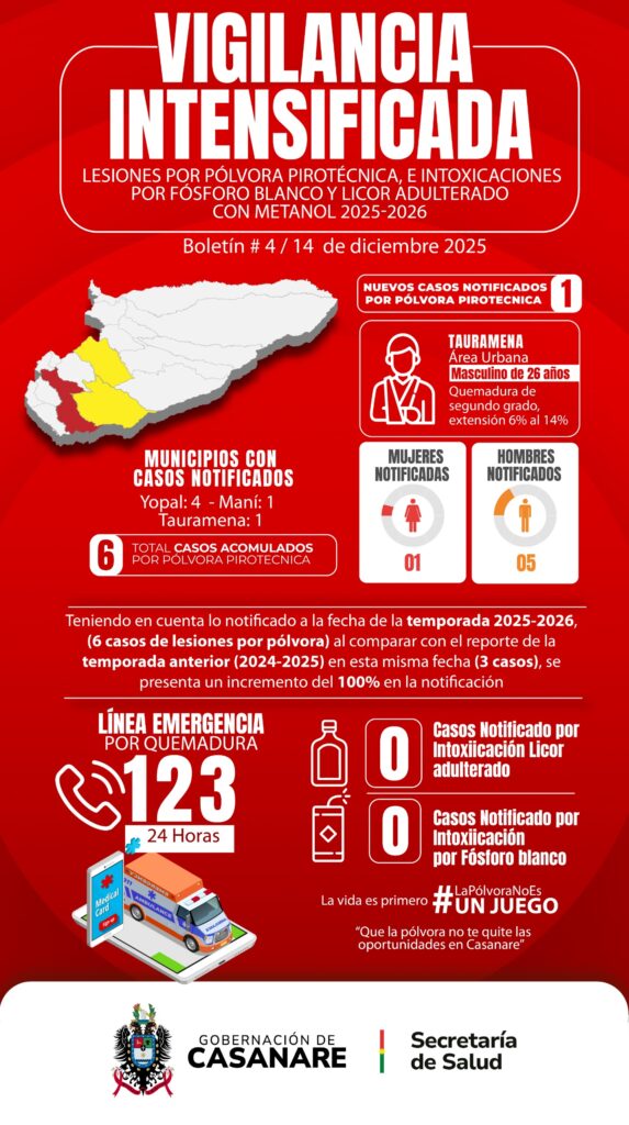 La temporada decembrina ya deja un incremento preocupante en las lesiones por pólvora en Casanare. De acuerdo con el más reciente reporte de vigilancia en salud pública, seis personas han resultado lesionadas entre el 1 y el 14 de diciembre de 2025, cifra que representa un aumento del 100% frente al mismo periodo de la temporada anterior, cuando se habían registrado tres casos.