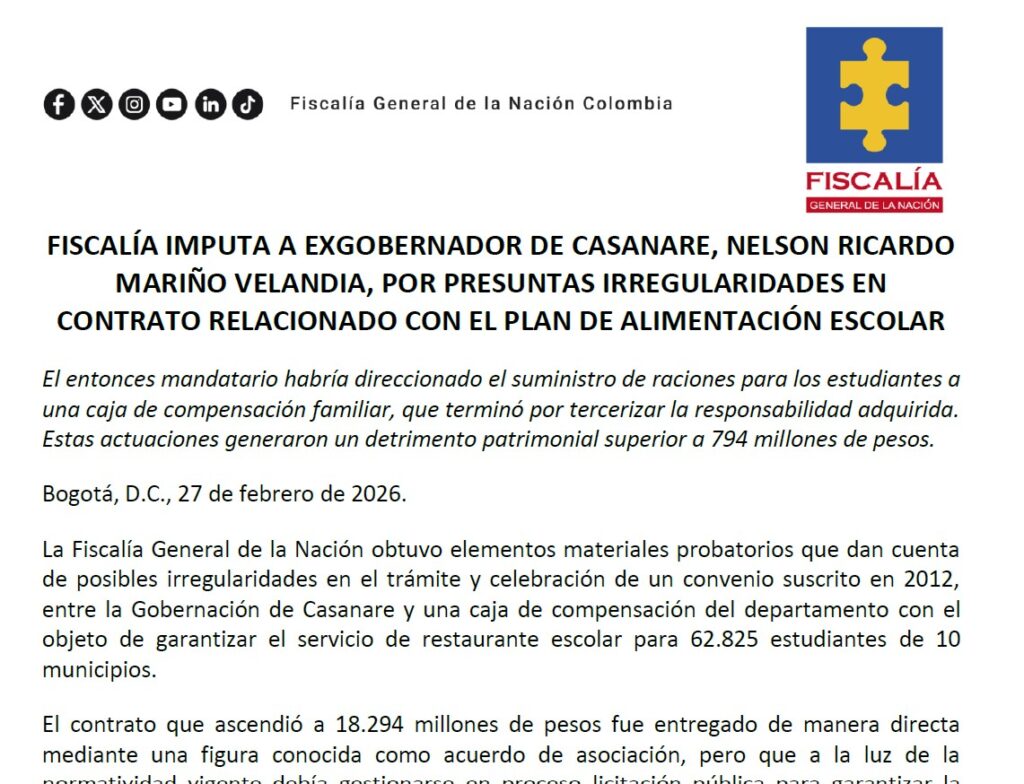 Un caso que durante años generó controversia en Casanare vuelve al escenario judicial. La Fiscalía General de la Nación imputó al exgobernador y exalcalde de Yopal, Nelson Ricardo Mariño Velandia, por presuntas irregularidades en un contrato relacionado con el Plan de Alimentación Escolar (PAE) suscrito en 2012.