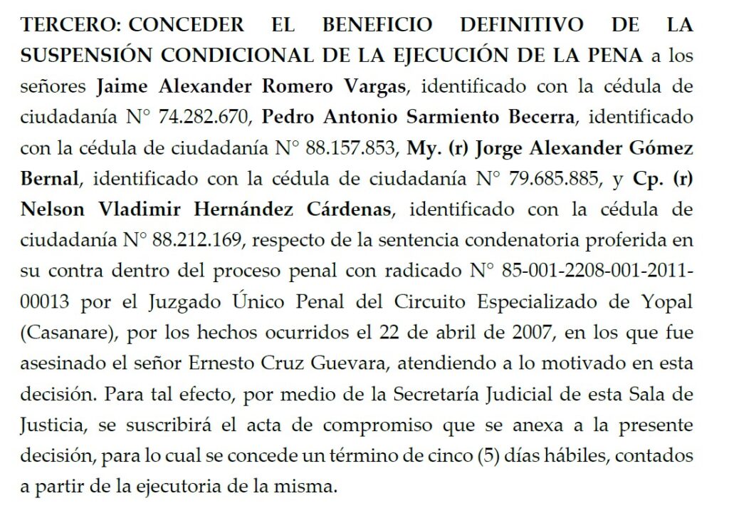 Los beneficiados —el mayor (r) Jorge Alexander Gómez Bernal, el cabo primero (r) Nelson Vladimir Hernández Cárdenas, y los exagentes del DAS Jaime Alexander Romero Vargas y Pedro Antonio Sarmiento Becerra— no fueron considerados máximos responsables. Pero eso no los libera de una obligación: